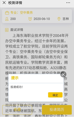 2.点击面试信息后,可以了解到有关专业介绍,点击“收藏”按钮,可以收藏该面试信息;点击“投递简历”按钮,依次确定“声明”、“承诺书”后,确认选择校考省份,便投递成功。