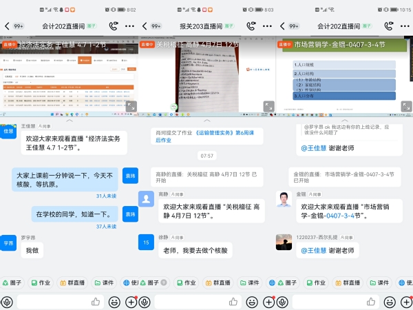 “云巡查”监督,助力线上学习教育。封闭管理期间,确保校内外学生准时上课,及时了解校内学生生活情况。学院充分发挥辅导员、行政人员、学生骨干,深入网络课堂做好监督工作,定期安排线上听课督查,检查学生到课情况。每日进行寝室“花式”签到打卡,以确保学生平安健康。本学期共巡查钉钉课堂462人次、寝室“云巡查”199人次、钉钉听课288人次。